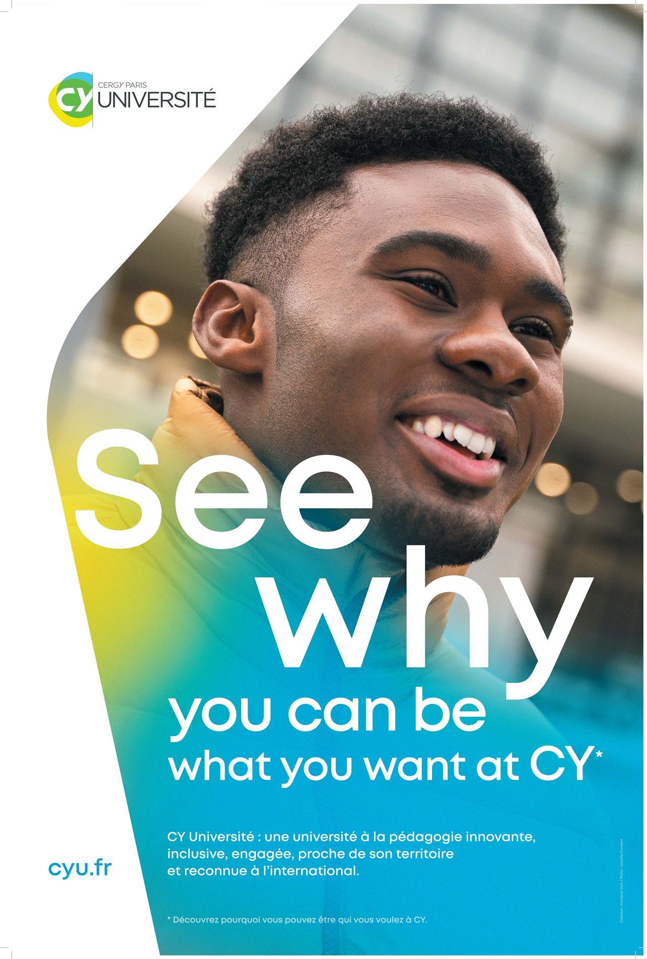 En mars 2022, CY Cergy Paris Université lance See Why, campagne de communication autour des valeurs de l’établissement à destination des lycéens, enseignants-chercheurs, étudiants internationaux mais aussi des entreprises et des collectivités territoriales, afin de mettre en lumière ses formations et tout ce que l'université offre en termes de parcours et de possibilités.