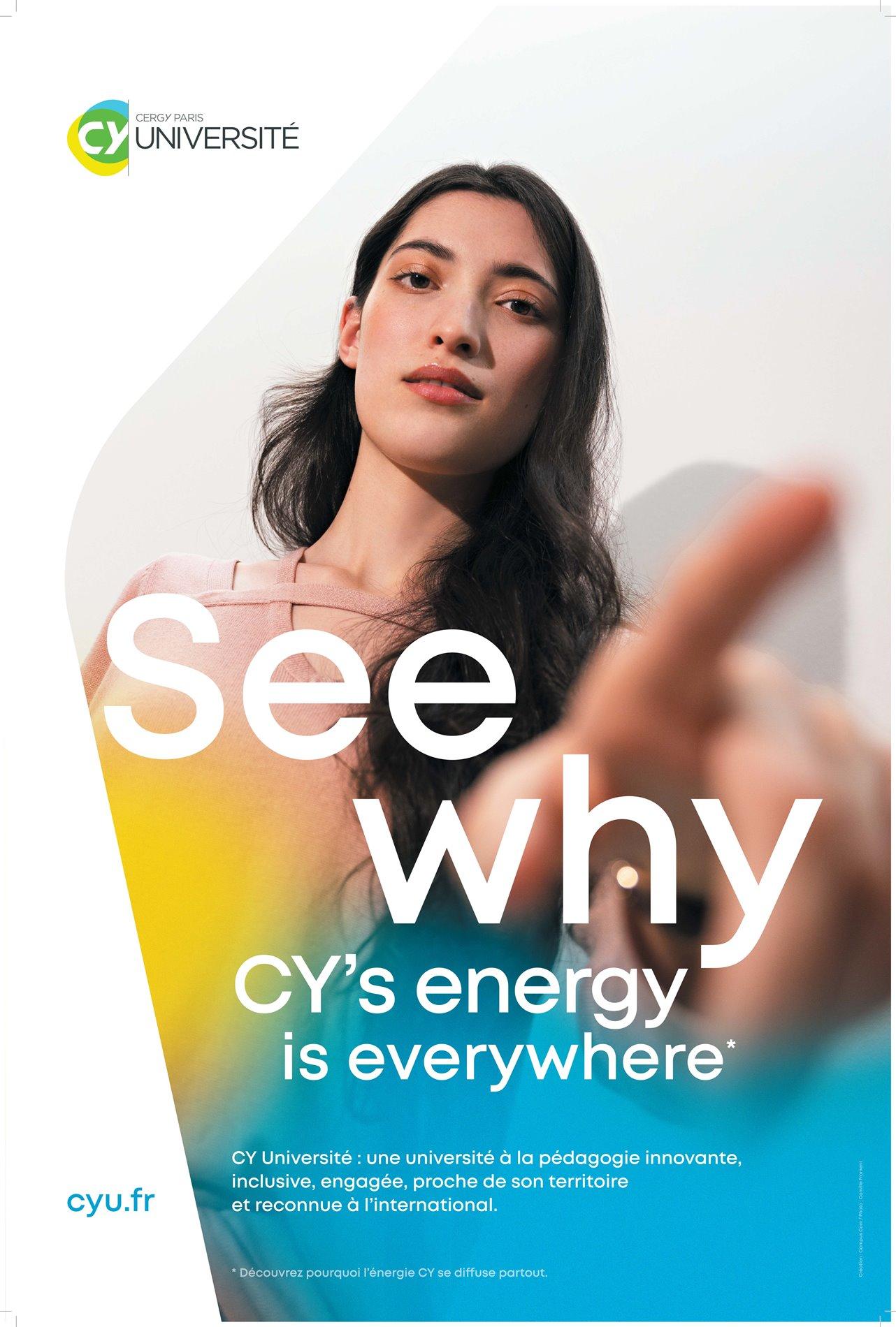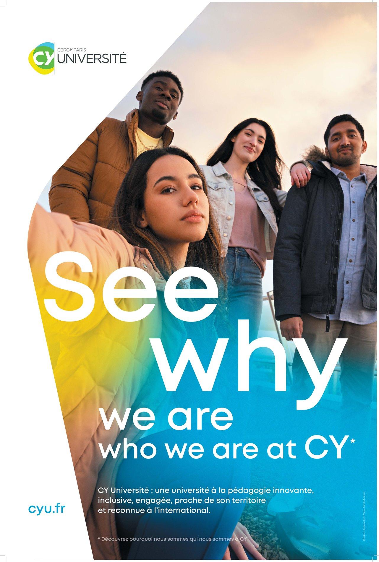 C'est en jouant sur la sonorité de son nom "CY" et de sa prononciation "See Why" que l’université installe sa marque et ses ambitions. Avec quatre de ses étudiants - Emma, Ilham, Antony et Ghislain - prêtant leur visage à cette campagne diffusée sur les réseaux sociaux, internet ainsi que dans le réseau de transports de Paris et ses environs, "CY Université" casse les codes traditionnels des films institutionnels de l'enseignement supérieur et de la recherche.